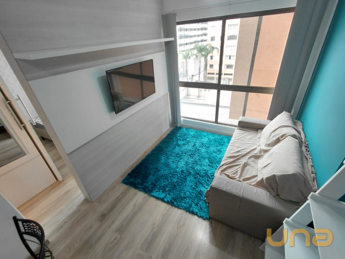 O imóvel com 01 dormitório equipado com armário embutido e painel para TV, cozinha integrada com armários planejados, micro-ondas, geladeira e lavadora de roupas. A sala possui painel e TV, sofá e mesa com quatro cadeiras, banheiro está equipado com chuveiro a gás, box em blindex e espelho.