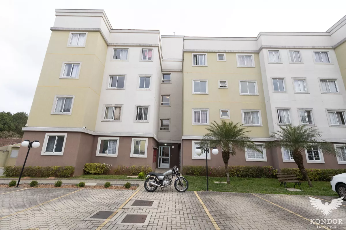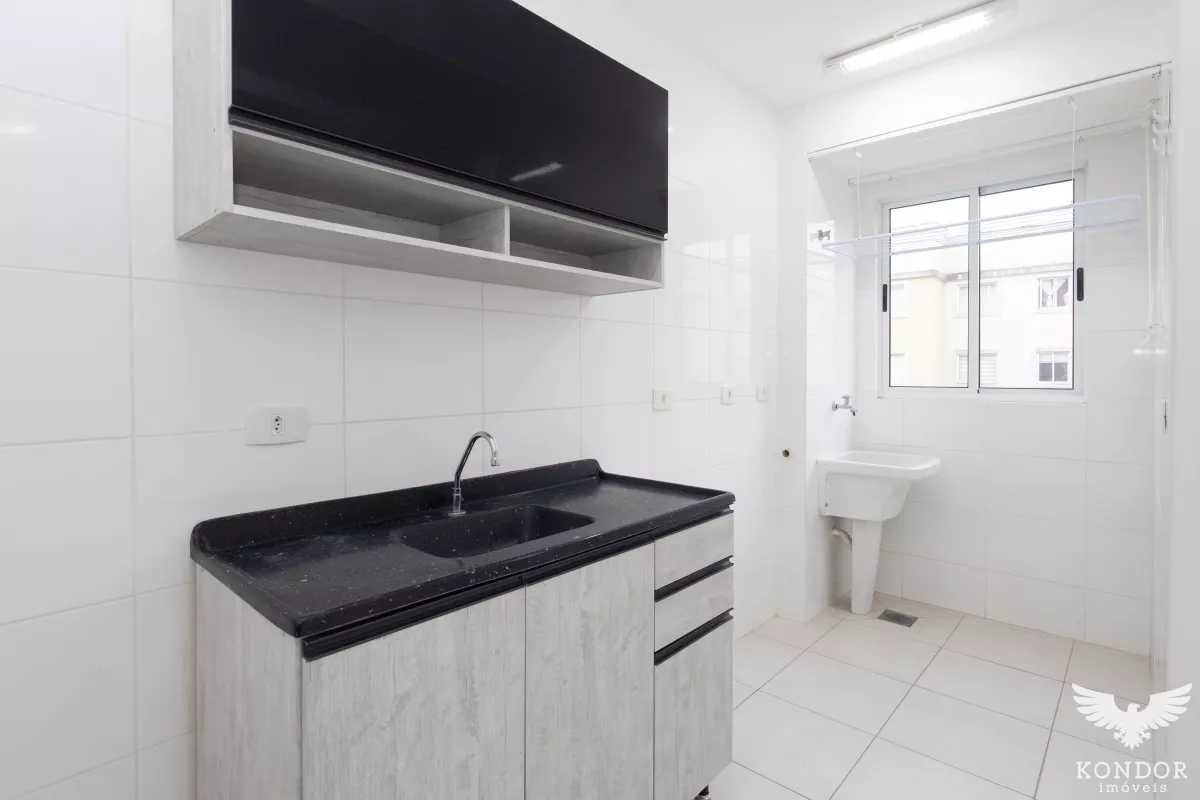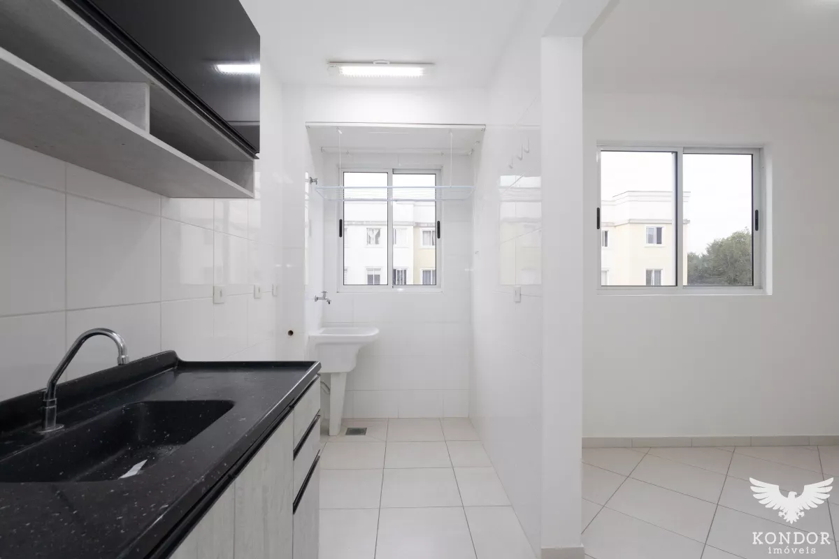 Apartamento com sala, cozinha com armários, área de serviço, banheiro e um quarto. Uma vaga de estacionamento, e condomínio com salão de festas. Divisa com Curitiba, a 500 metros do parque Tingui.