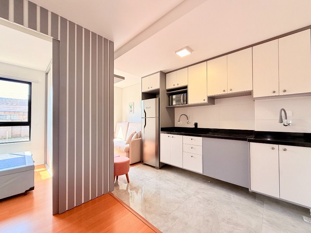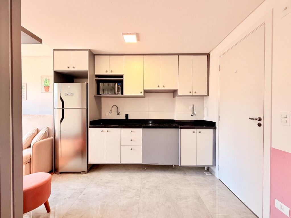 - Cozinha com cooktop de indução, geladeira e micro-ondas;
