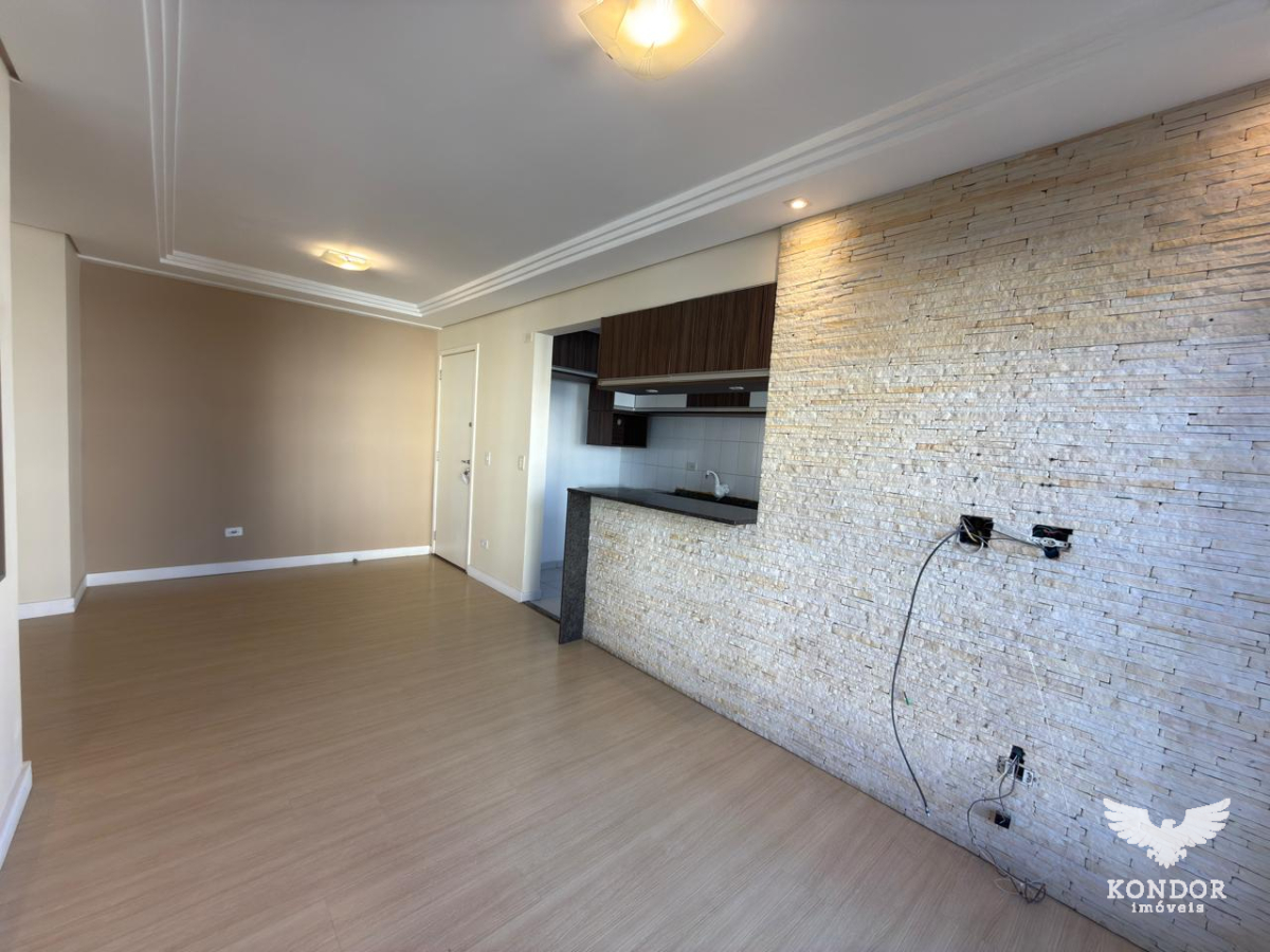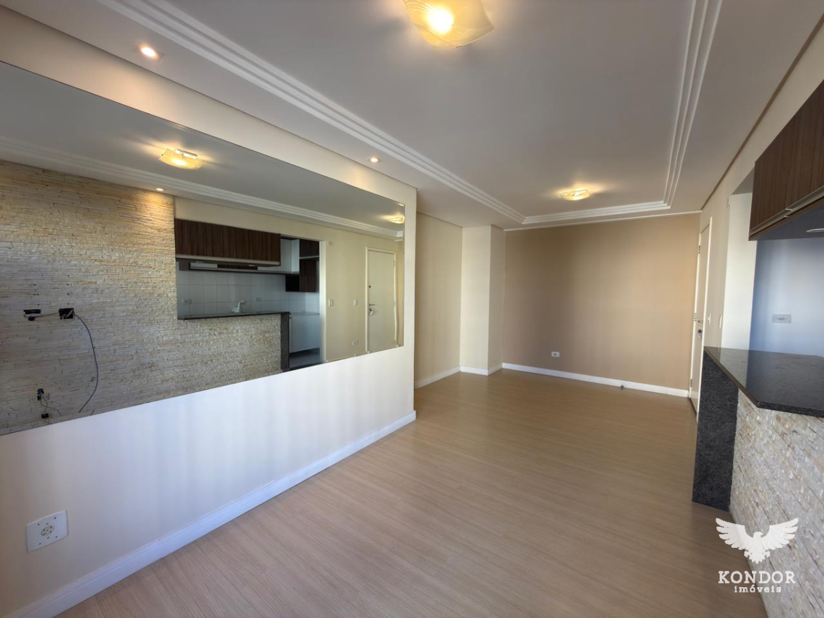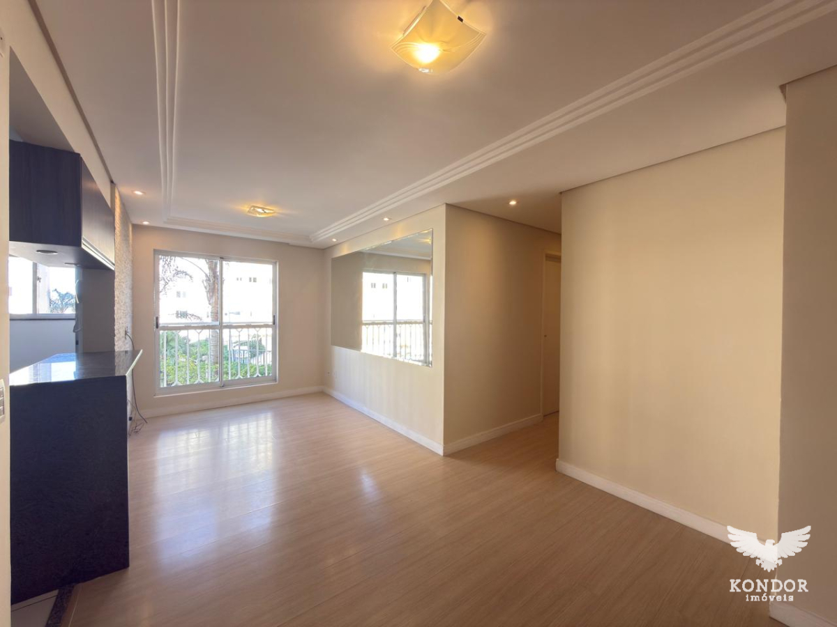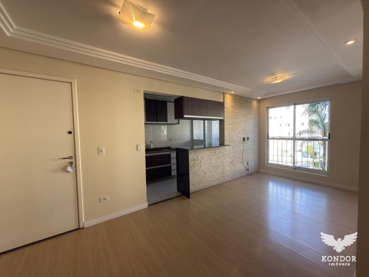 Apartamento com 60m² distribuídos em sala para dois ambientes, cozinha com armários, área de serviço, banheiro social e 2 dormitorios.