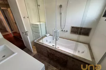 Piso em parquet, box de vidro temperado, e sistema de aquecimento a gás.