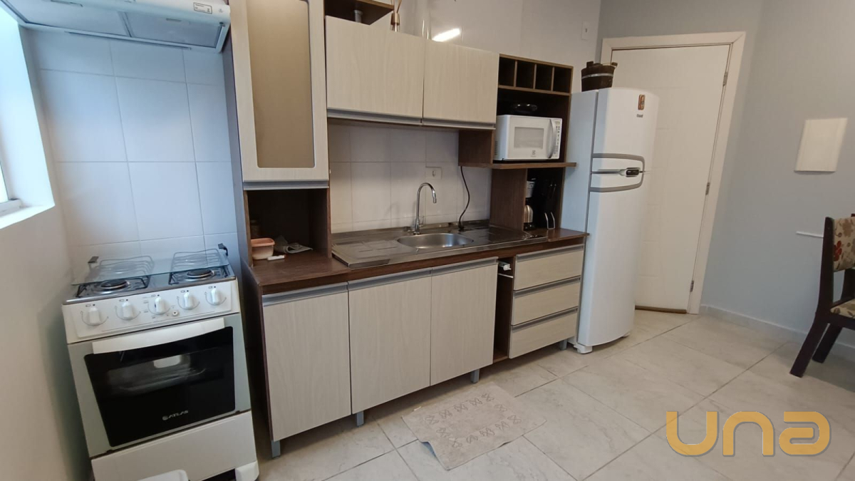 - Cozinha com armários, geladeira duplex, fogão, exaustor e microondas