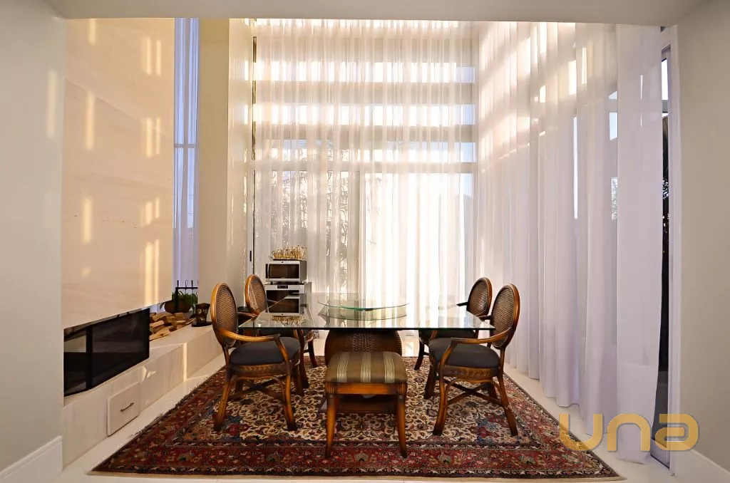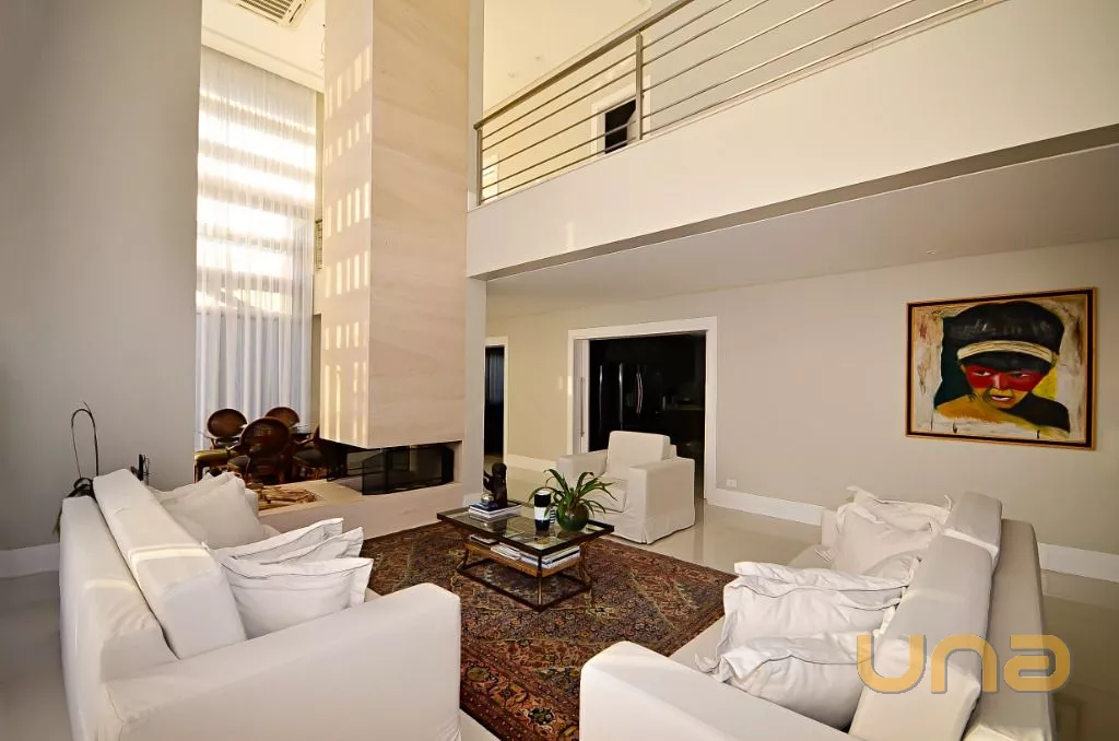 No 1º piso temos o Hall Social, Lavabo, Escritório, Amplo Living dividido em 02 ambientes por uma lareira (pé direito duplo), Sala de Projeção, Ampla Copa/Cozinha, em anexo temos uma Ampla área Gourmet, contendo uma churrasqueira completa, sala de estar e lavabo, jardim e quintal,