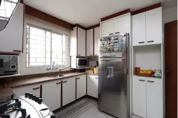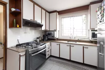 A ampla cozinha integrada à sala de jantar, equipada com armários planejados e tampos em granito, forno elétrico, fogão cooktop e coifa Brastemp Ative. Conta ainda com pia de duas cubas em inox, churrasqueira a carvão e um pequeno fogão a lenha.