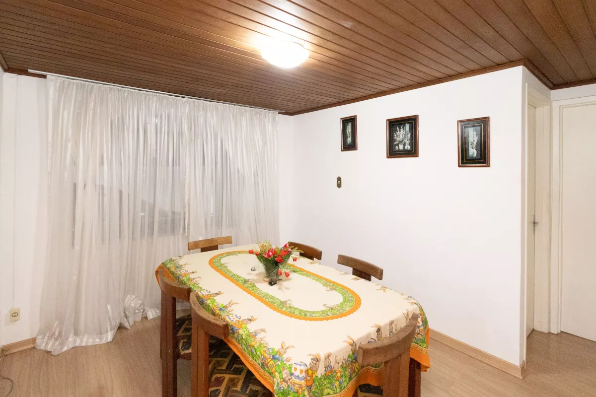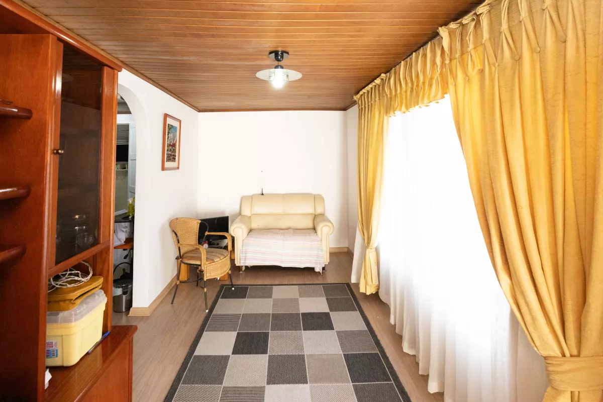 A casa dos fundos com 90m², com sala, copa/cozinha, 03 quartos, 02 banheiros e lavanderia externa.