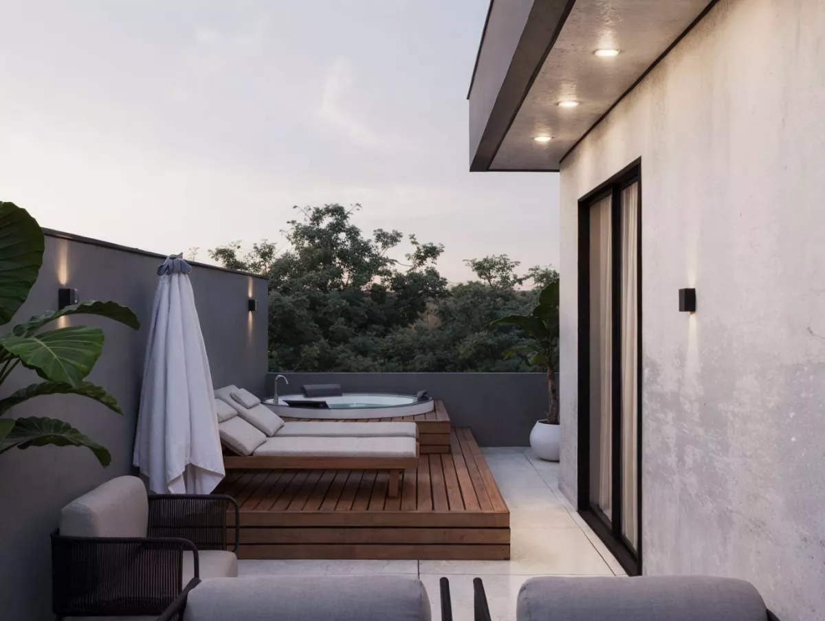 Com 147,59 m² distribuídos em sala de estar, lavabo, copa/cozinha, área de serviço, 3 quartos (sendo 1 suíte), banheiro social, amplo atico com banheiro e area externa + 26m2 de terraço + 13,10m2 de jardim.