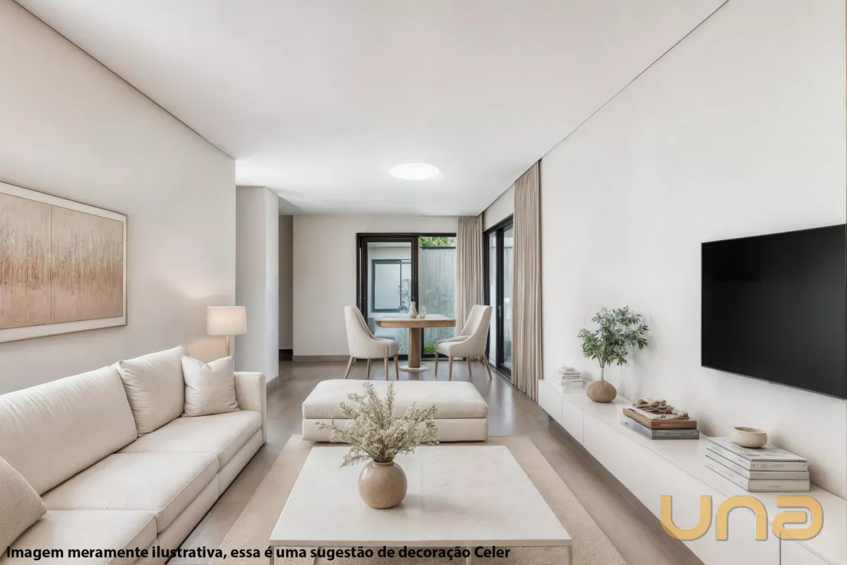 No pavimento térreo contem sala de estar e jantar, lavabo, cozinha, área de serviço e 1 vaga de garagem. O 1° pavimento é composto por 03 dormitórios, sendo 01 suíte, banheiro social. O 2° pavimento possui sala e um terraço externo com 21,68m².